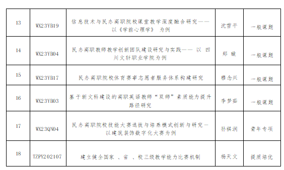 根據(jù)《四川文軒職業(yè)學院科研管理辦法》和《關(guān)于2024年度校級課題結(jié)題評審結(jié)果的公示》[川文職院科〔2024〕44號]的要求,經(jīng)專家組評審,科研處復核,公示復議后,18項校級課題完成研究工作,同意結(jié)題,現(xiàn)將結(jié)題名單(見附件)予以公布,請課題負責人到科研處領(lǐng)取結(jié)項證書。