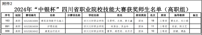 2月20日,四川省教育廳公布了2024年“中銀杯”四川省職業(yè)院校技能大賽獲獎(jiǎng)名單,我院參賽師生團(tuán)隊(duì)經(jīng)過(guò)激烈的賽事角逐,在護(hù)理技能、康復(fù)治療技術(shù)、建筑裝飾數(shù)字化施工3個(gè)競(jìng)賽項(xiàng)目中脫穎而出,榮獲二等獎(jiǎng)一項(xiàng),三等獎(jiǎng)兩項(xiàng)。