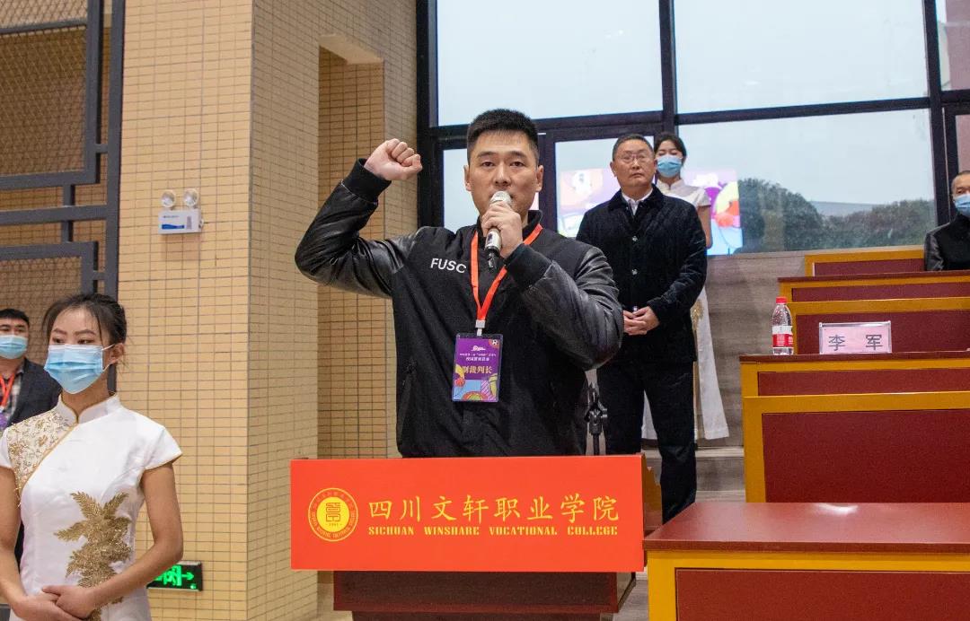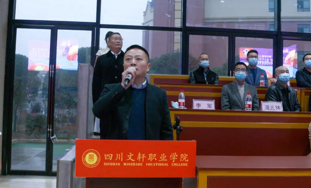 現(xiàn)場全體人員奏唱中華人民共和國國歌,四川文軒職業(yè)學(xué)院黨委書記、四川省人民政府督導(dǎo)專員余文盛致歡迎詞。